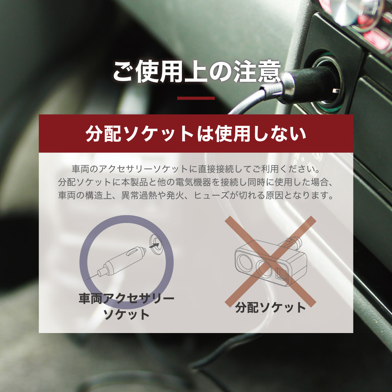 分配ソケットに本製品と他の電気機器を接続し同時に使用した場合、車両の構造上、異常過熱や発火、ヒューズが切れる原因となります。